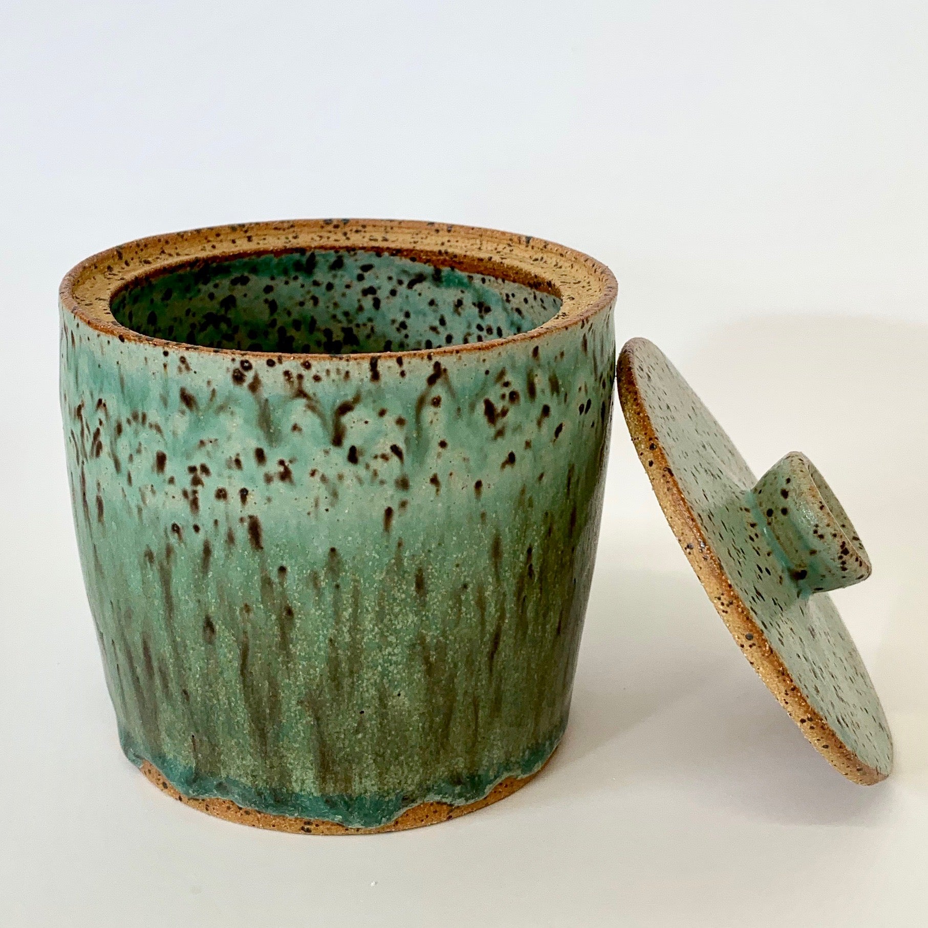 The container and lid are wheel thrown and slight imperfections are all part of the creating.